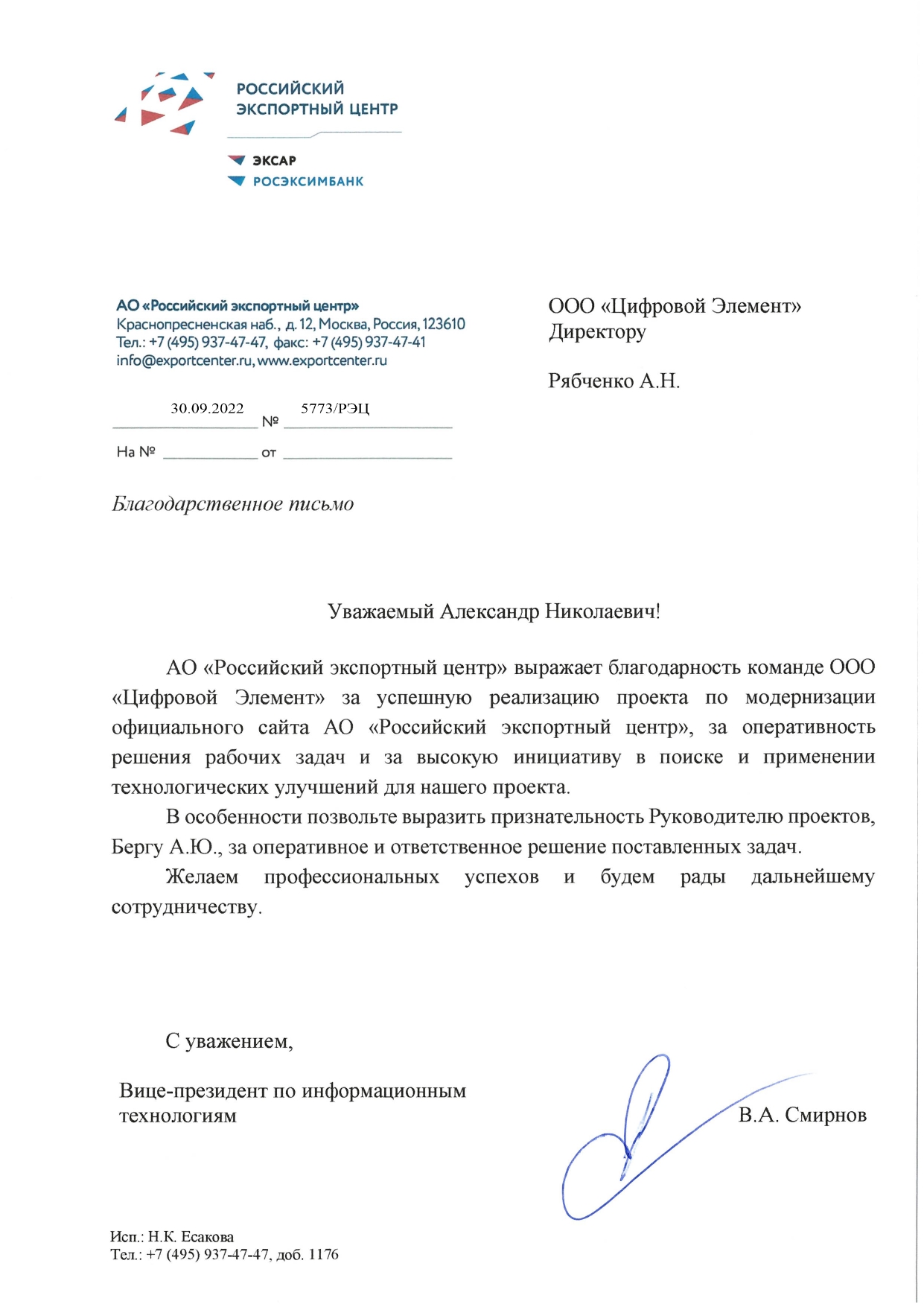 АО «Российский экспортный центр» выражает благодарность команде ООО «Цифровой Элемент» за успешную реализацию проекта по модернизации официального сайта АО «Российский экспортный центр», за оперативность решения рабочих задач и за высокую инициативу в поиске и применении технологических улучшений для нашего проекта.