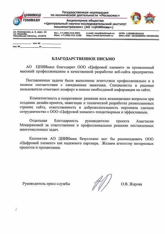АО ЦНИИмаш благодарит ООО «Цифровой Элемент» за проявленный высокий профессионализм в качественной разработке веб-сайта предприятия. Поставленные задачи были выполнены агентством профессионально и в полном соответствии с ожиданиями заказчика. Специалисты и рядовые пользователи отмечают комфорт в поиске необходимой информации на сайте. Коллектив АО ЦНИИмаш безусловно мог бы рекомендовать ООО «Цифровой Элемент» как надёжного партнёра. Желаем агентству интересных проектов и процветания.