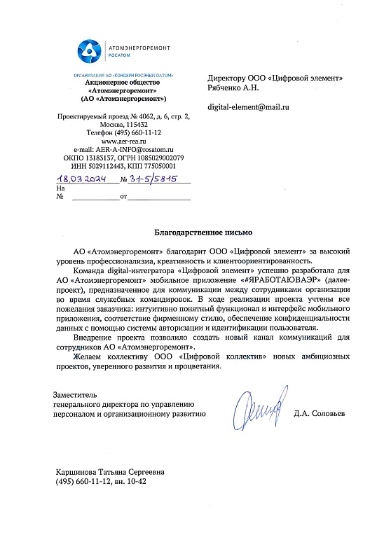 АО «Атомэнергоремонт» благодарит ООО «Цифровой элемент» за высокий уровень профессионализма, креативность и клиентоориентированность.