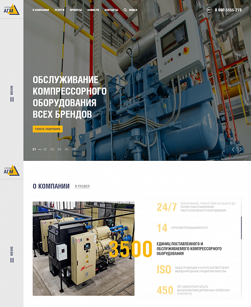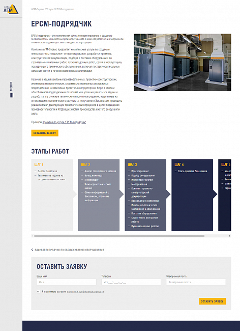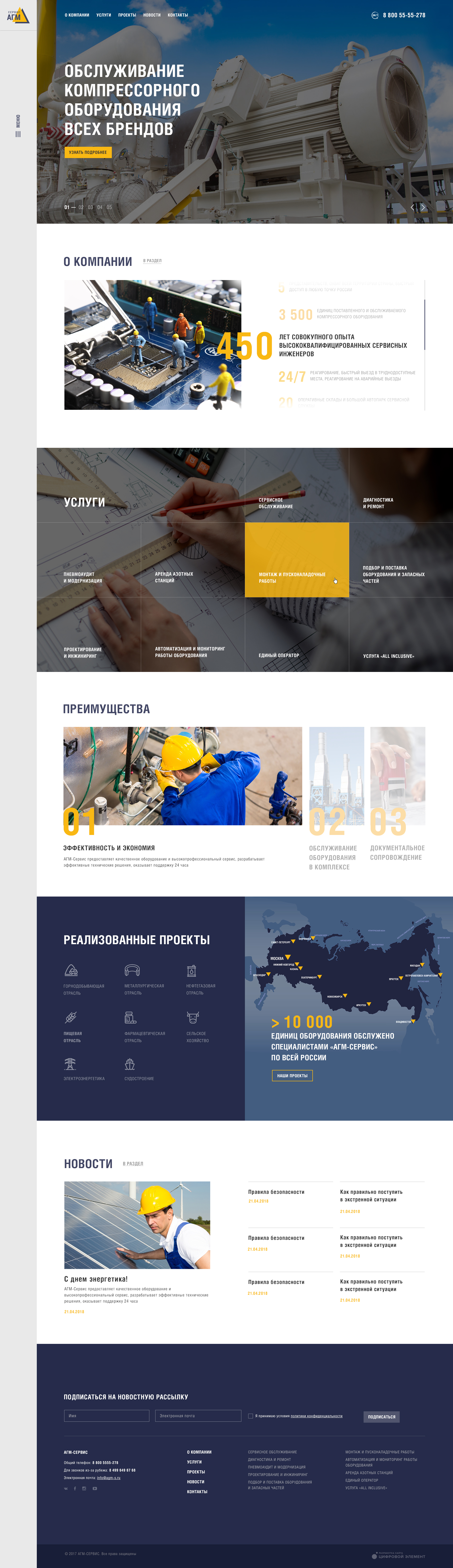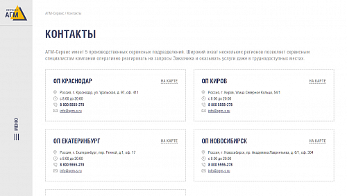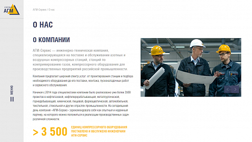 Мы тесно сотрудничали с компанией «АГМ-Сервис» на протяжении ведения всего проекта, так как у них было четкое представление о дизайне, реализацией которого мы занимались от начала и до конца. Также был запрос на то, чтобы была возможность удобного редактирования, что нам успешно удалось реализовать при помощи редактируемых блоков. С их помощью наш клиент может наполнять сайт и менять блоки местами без обращения к специалистам в любом из разделов сайта по мере необходимости.