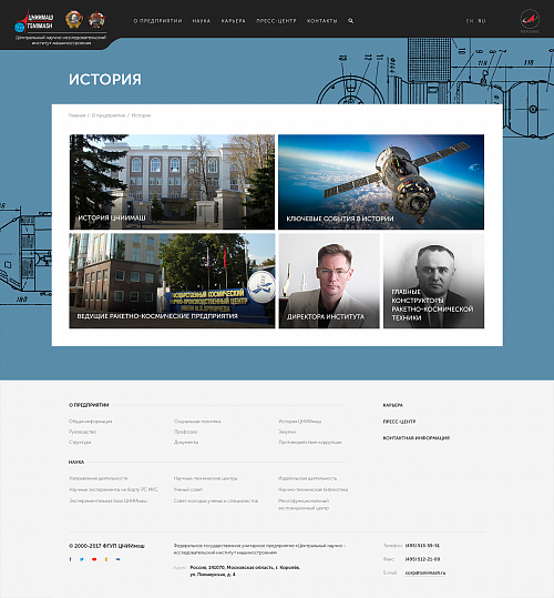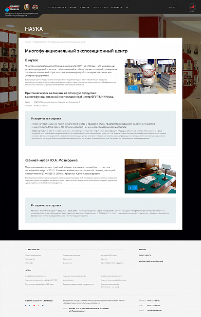Центральный научно-исследовательский институт машиностроения (ЦНИИмаш) – это огромное предприятие с богатой историей и множеством подразделений, которые нам пришлось объединить вокруг единой цели по созданию нового сайта. Рабочая группа над проектом состояла из 12 человек, каждый из которых обладал своим бесценным опытом и компетенцией. Нам приходилось находить решения, которые бы устраивали всю рабочую группу и решало поставленные задачи в рамках современных тенденций в веб-дизайне. Объем переработанной информации и составленной документации по проекту просто ошеломляющий. Мы справились! Мы гордимся результатом! Спасибо заказчику, который был готов к тесной совместной работе, и всей нашей команде!